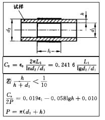 電極可選用5.1.3中任意一種。如果不用保護環,而且試樣上下的兩個電極難以對齊時,其中一個電極應比另一個電極大些。已經加有電極的試樣應放置在兩個金屬電極之間,這兩個金屬電極要比試樣上的電極稍小些。對于平板形和圓柱形這兩種不同電極結構的電容計算公式以及邊緣電容近似計算的經驗公式由表1給出。