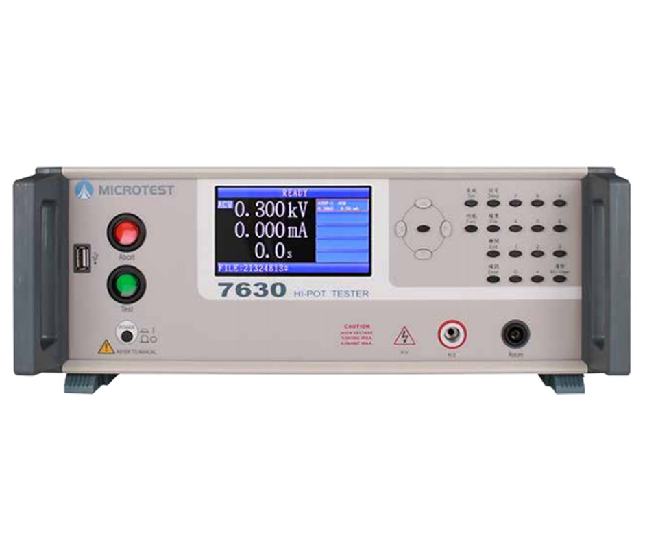 7630為2通道耐壓測試儀,AC 高壓5000V,DC 高壓6000V,絕緣阻抗1.2G?。內部記憶體可存30組測試檔案,每組檔案支援16組測試步驟。USB Host 可儲存檔案及更新韌體??蛇B接USB Device/RS-232傳送指令至電腦。另外待測物測試不良時,可加裝不良的通道警示燈,透過Remote Port輸出信號判斷。耐高壓測試儀為驗證產品的品質和電氣安全特性的一種測試。一般適用于進料檢驗,制程控制,生產線,或研發等檢測部門。