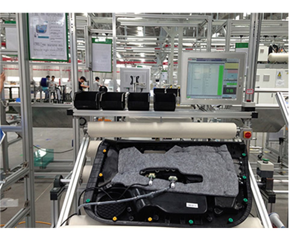 從上一個工位取一個門板,放到測試架上,掃描門板上的條碼,然后,放對應安裝組件的框前指示燈會亮。接著操作員從對應的框中取出相應的組件,通過掃描組件上的條碼來確認組件是否正確(在進行規格設定的時候,都已經將每個門板上對應組件的條碼輸入進去了),在掃描組件條碼確認OK后,對應的框前指示燈會熄滅。然后操作員將組件安裝到門板的指定位置,接上測試連接線。接著操作員按照固定的順序對門板的開關按鍵進行一一測試。測試完成后所有數據會存儲。